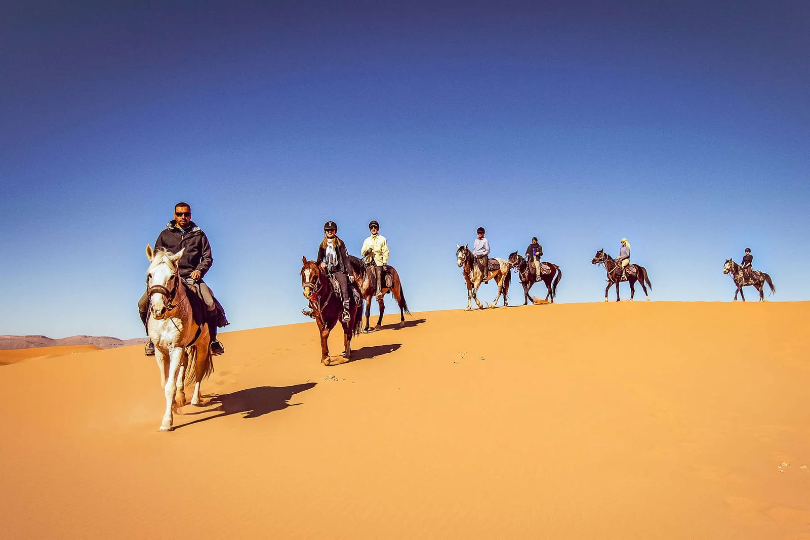 Your journey begins at sunrise, when the light paints the sands in gold and amber. Guided by experienced horsemen who know the desert like home, you’ll explore hidden oases, ancient caravan paths, and wide open plains where time seems to stand still.